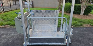 We rent portable wheelchair lifts and ADA ramps. This is our Mobilift CX mobile wheelchair lift. It has built in wheels for easy mobility. Most cities are requiring these type of units for stage setups.