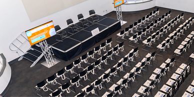 We provided this 20 x 20 platform stage with a 16 x 9 led video wall.